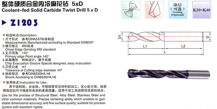 整體硬質(zhì)合金內冷麻花鉆5xD說(shuō)明: