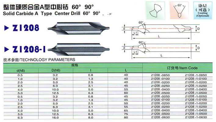 整體硬質(zhì)合金A型中心鉆60°90°說(shuō)明: